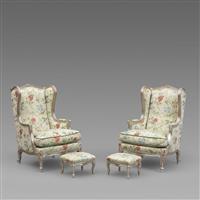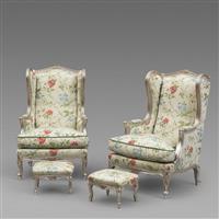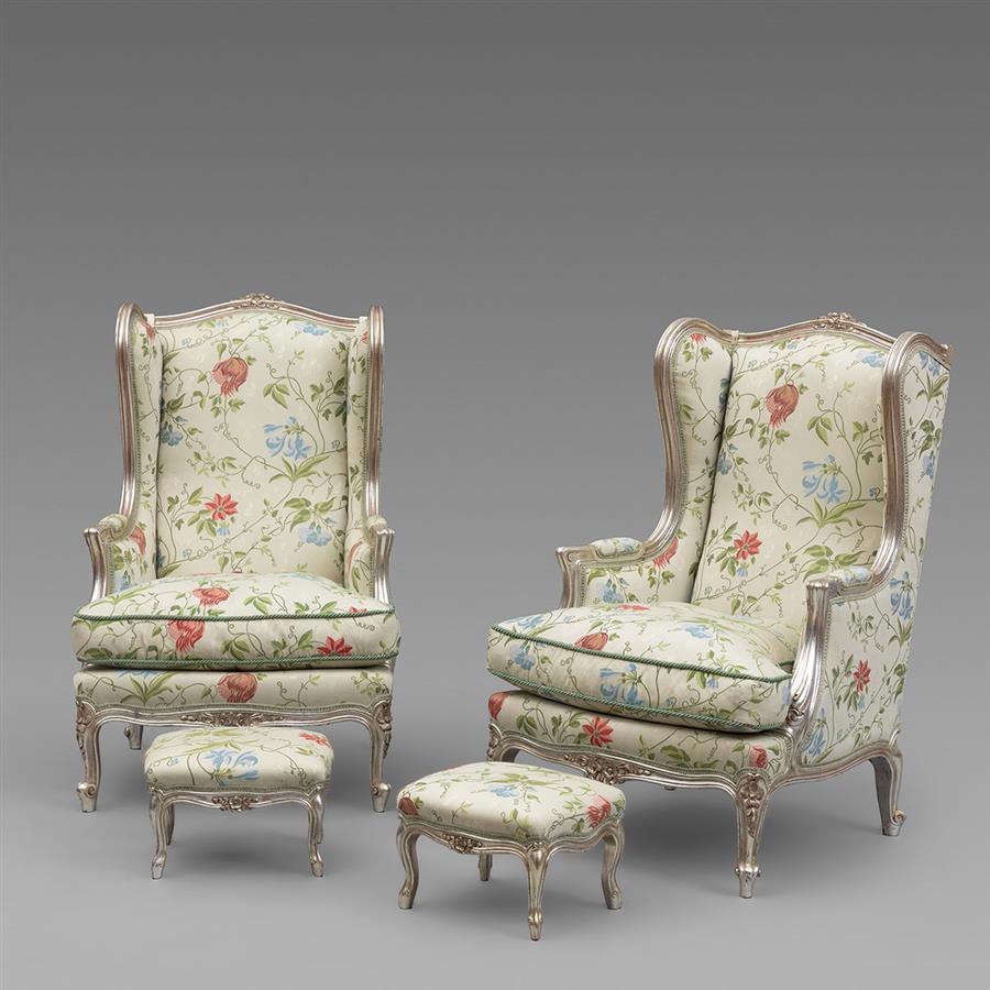 一对路易十五样式锦缎软包贴银山毛榉木雕花安乐椅和脚凳