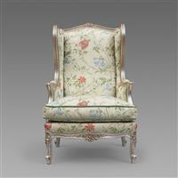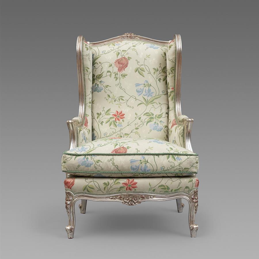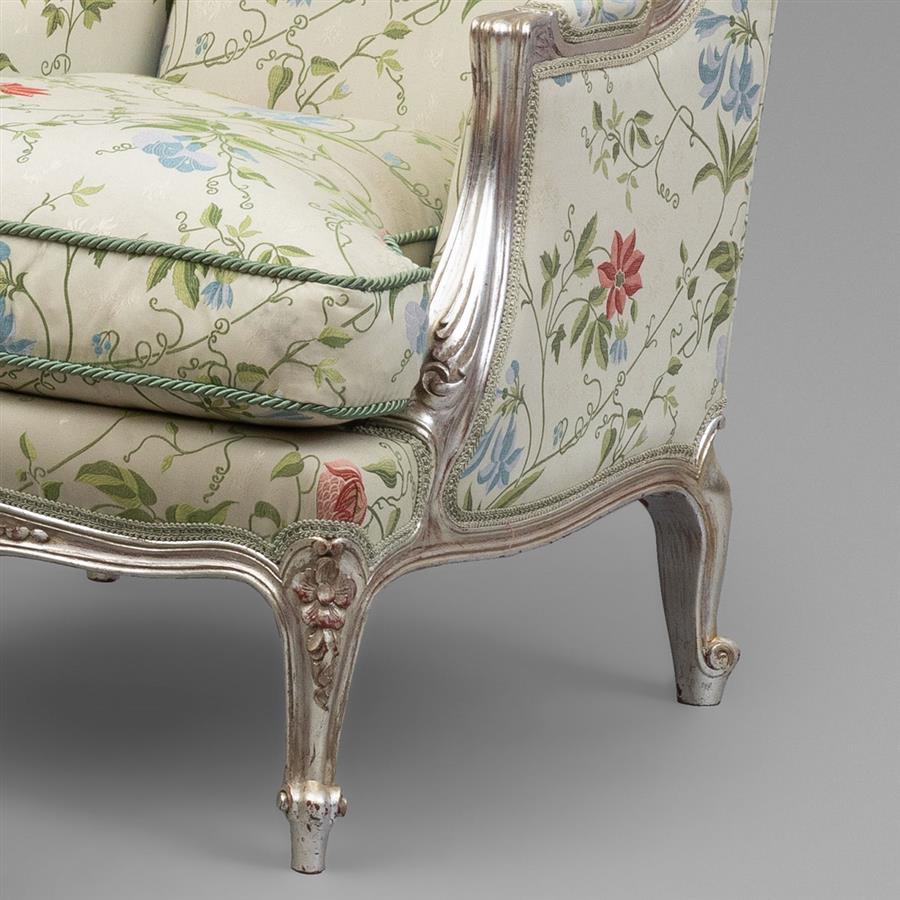 路易十五洛可可风格,贴银箔山毛榉木框架。靠背顶部中央雕刻花卉纹饰,扶手弯曲雕刻卷叶纹,支撑柱内缩于前腿,与座面侧档连接一体;座面望板和弯腿雕刻呼应的花卉纹饰;脚凳雕刻与安乐椅相同的花卉纹饰。米色花卉织锦缎软包靠背和座面。