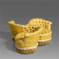 路易十六新古典风格,山毛榉木框架贴金箔装饰。沙发靠背与高扶手顶端外翻,雕刻茛苕叶纹和十字结;支撑柱雕刻茛苕花苞与椅腿连接一体,座面望板雕刻绳纹装饰,圆锥椅腿内雕螺旋纹。双层座垫,米白色刺绣亚麻软包。