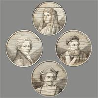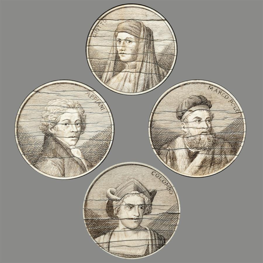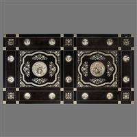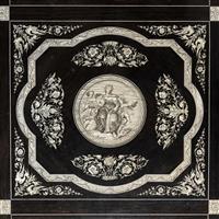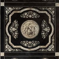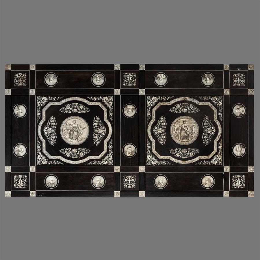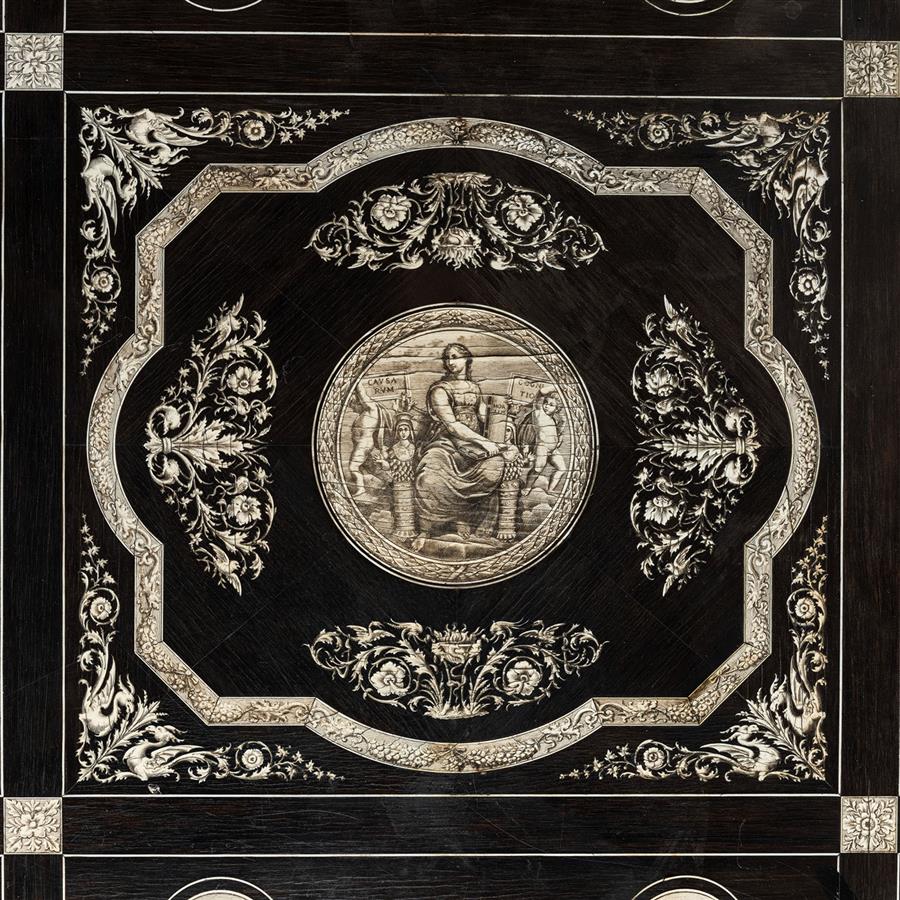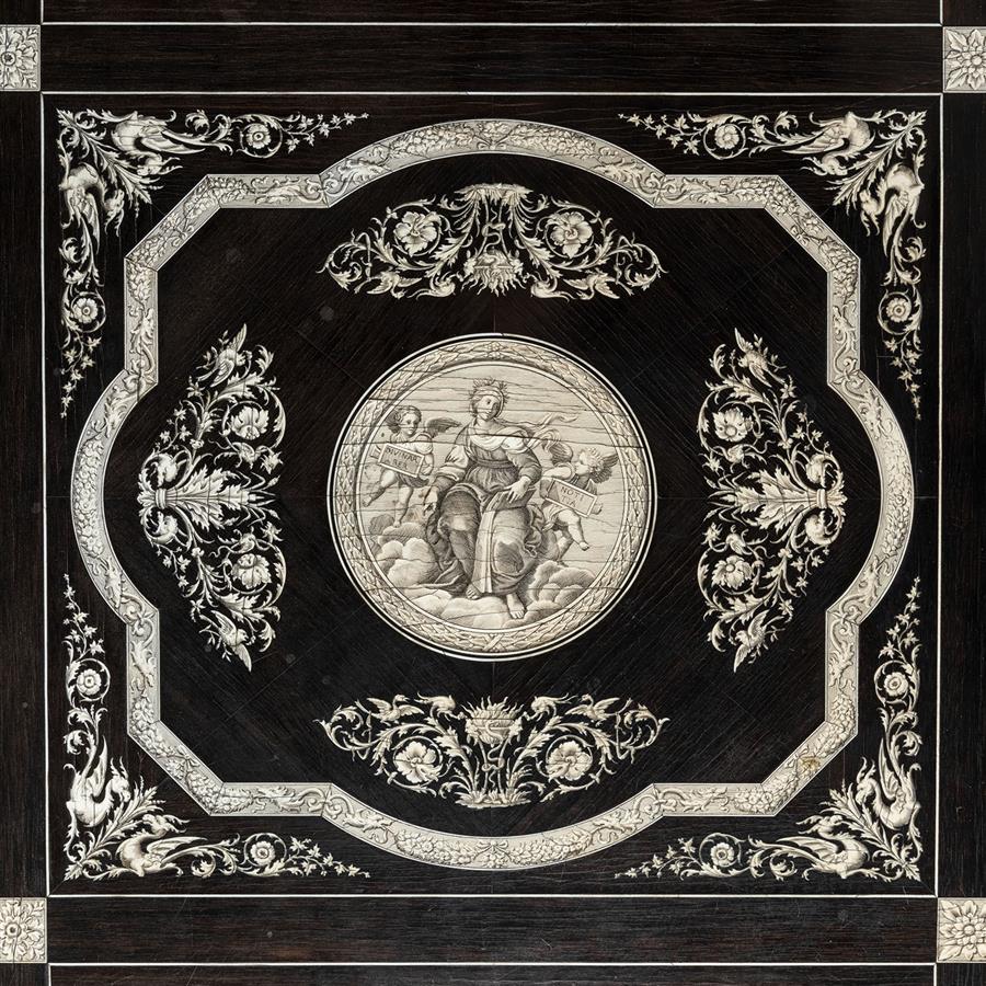 意大利新文艺复兴风格,印度黑檀木主体。线镶嵌将桌面分割为两个方形部分,每组矩形框内镶嵌两组纪念章胸像共十四只,分别代表了意大利历史上的伟人,如伽利略、马可波罗、乔托、但丁等。两个方形部分中央镶嵌花卉和藤蔓环绕的来自拉斐尔为梵蒂冈签字大厅绘制的寓意天顶画“哲学”和“诗歌”,四角镶嵌花卉藤蔓环绕的小天使。
