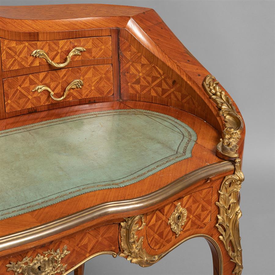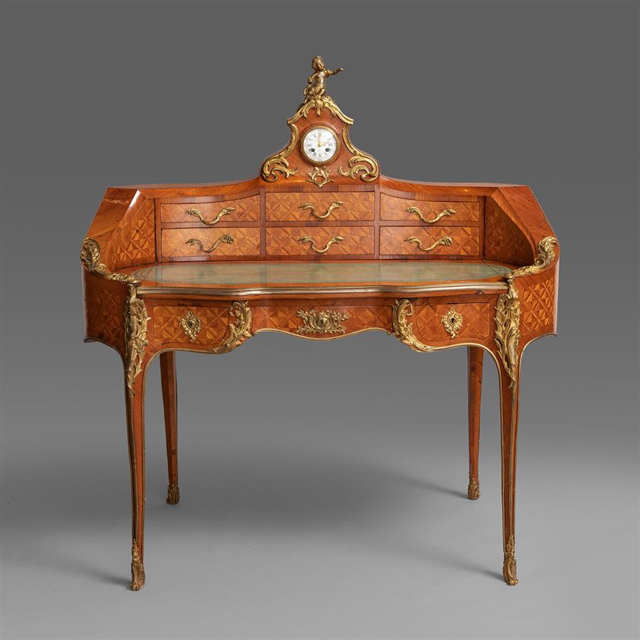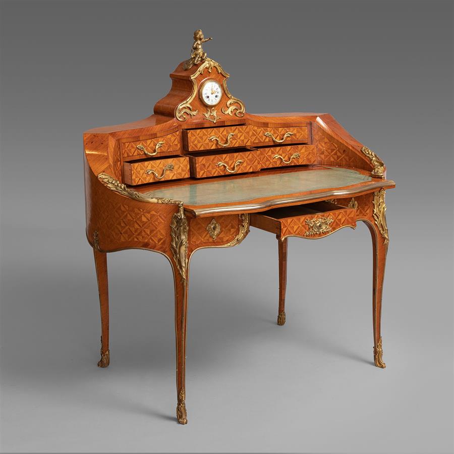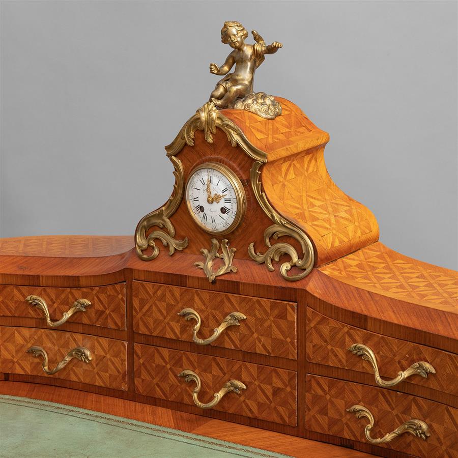路易十五洛可可风格,橡木主体,西阿拉黄檀木贴面。桌体立面东印度缎木镶花镶嵌几何纹饰,阶梯叠橱拱顶有一只装饰铜鎏金小天使的八天时钟,双排六只小抽屉装饰铜鎏金茛苕枝叶拉手;拉伸牛皮书写面,中楣抽屉装饰铜鎏金茛苕叶纹锁眼盖;三弯腿立柱装饰上下呼应的铜鎏金茛苕叶饰。