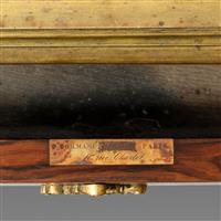 路易十五洛可可风格,橡木主体,西阿拉黄檀木镶花贴面。黑色牛皮桌面外缘装饰铜鎏金边条,三只楣抽屉装饰呼应的铜鎏金茛苕枝叶拉手和锁眼盖,两侧板装饰有铜鎏金枝叶花卉饰件;三弯腿立柱装饰上下呼应的铜鎏金茛苕叶饰。中央抽屉锁具面板有制造商P. SORMANI / 10 rue Charlot / PARIS刻印签名。