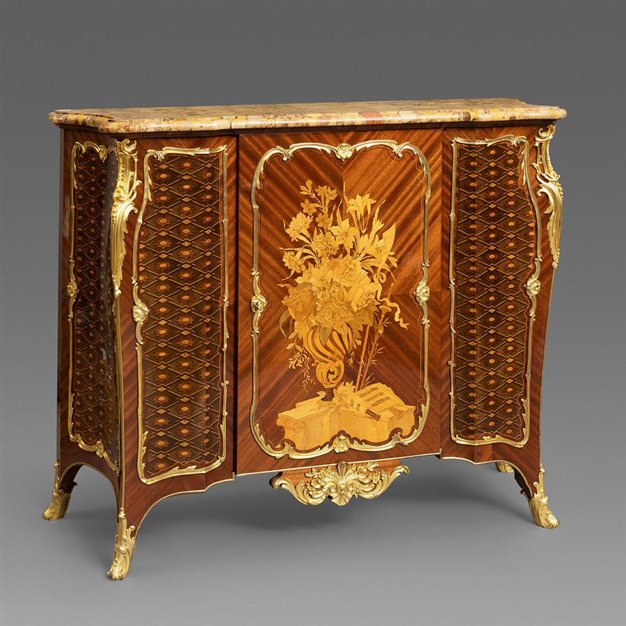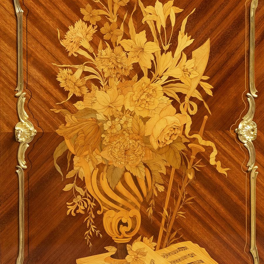 路易十五洛可可风格,像木主体,郁金香木四分贴面,阿勒颇彩色角砾岩大理石顶面。中央柜门铜鎏金茛苕枝叶边条开光,内部多种木材镶嵌极为精美繁复的花卉乐谱纹饰,两侧及柜体两侧镶板交错的菱形网格内镶嵌向日葵纹饰;立水装饰卷曲的花卉枝叶铜鎏金饰件,立柱装饰上下呼应的铜鎏金茛苕叶饰。柜体背面龙骨右侧有制造商Henry Dasson/1883钢印。