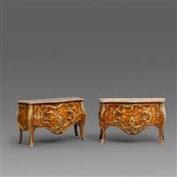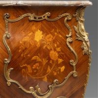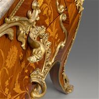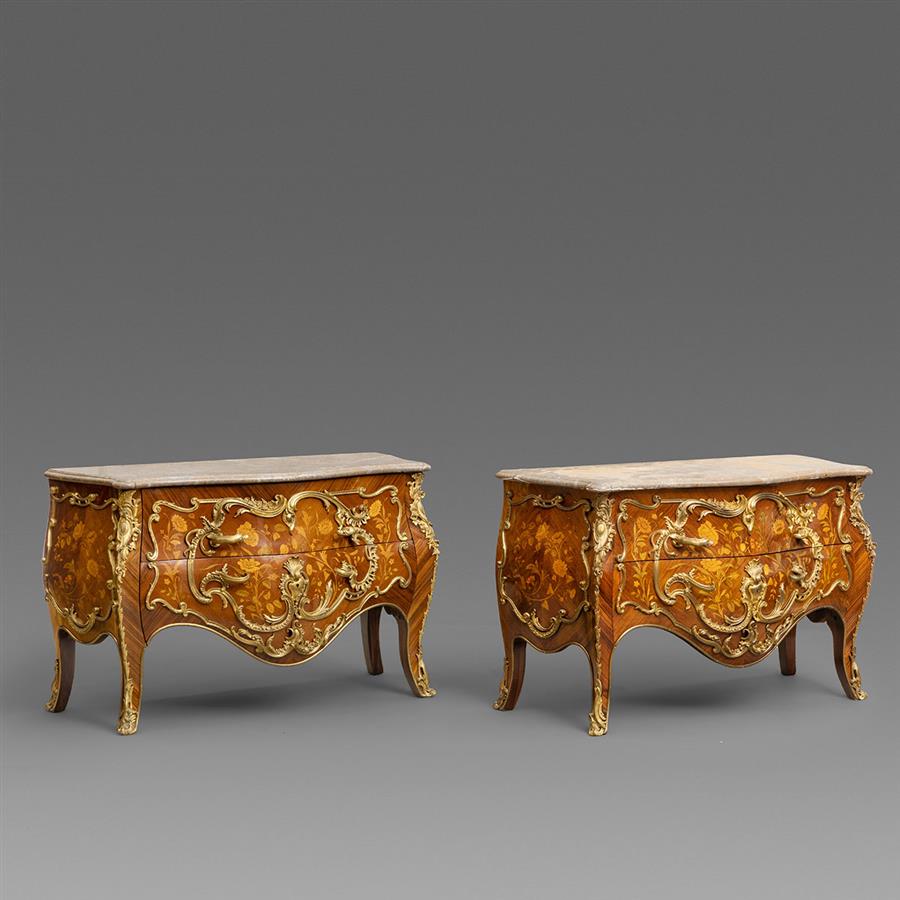 一对路易十五样式铜鎏金装饰缎木和果木细工镶嵌西阿拉黄檀木抽屉柜
