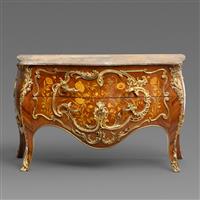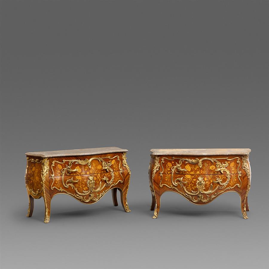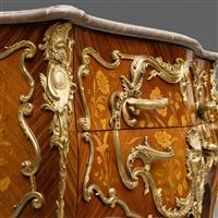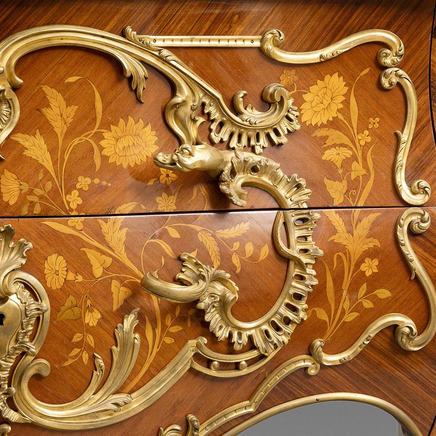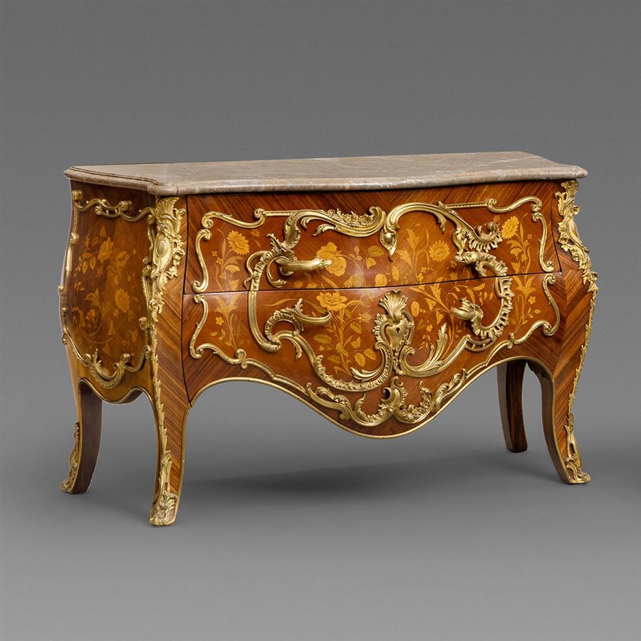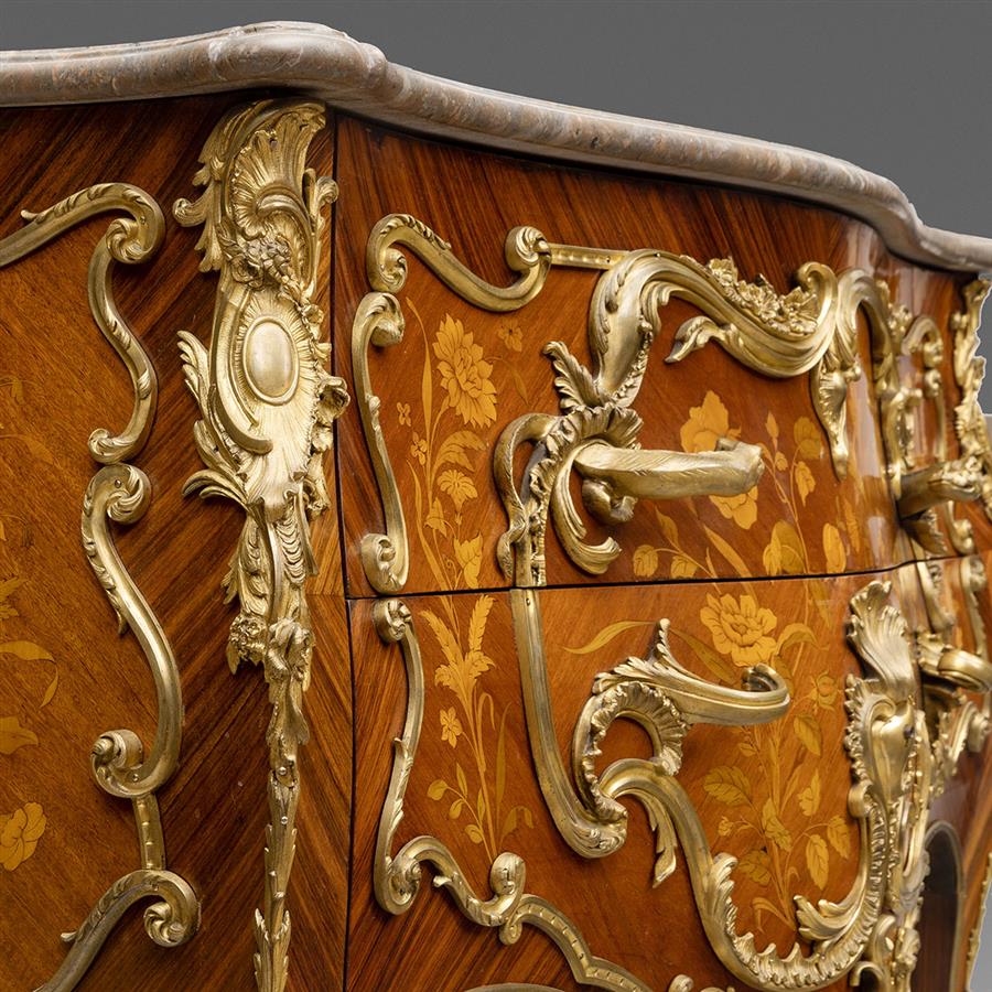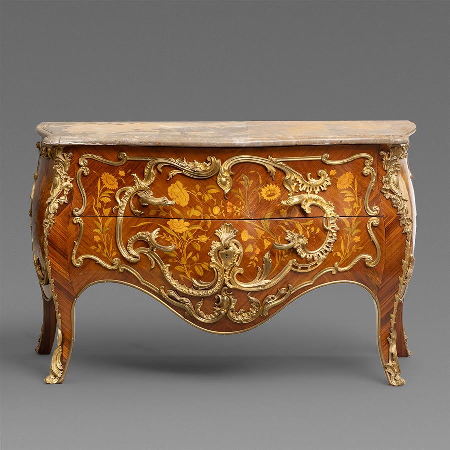 此作品基于1750年代皮埃尔·鲁塞尔和阿德里安·德洛姆合作的抽屉柜(现收藏于巴黎小皇宫)为原型制作。路易十五洛可可风格,山毛榉木主体,西阿拉黄檀木贴面,灰粉角砾岩大理石顶面。双层抽屉面板外廓装饰铜鎏金涡卷边条,缎木底板,梧桐、冬青、鹅耳枥和梨木等多种木材镶嵌花卉枝叶纹,由龙首和棕榈组成的C形拉手,以及扇形茛苕锁眼盖连接而成的内环铜鎏金饰带被誉为洛可可风格在二维和三维设计的最高成就。柜体两侧板铜鎏金边条内缎木、梧桐和冬青等木材细工镶嵌涡卷花束,三弯腿立柱装饰上下呼应的铜鎏金茛苕叶饰。其中一只抽屉柜正面右侧铜鎏金饰件边缘有制造商F. Linke刻印签名。
