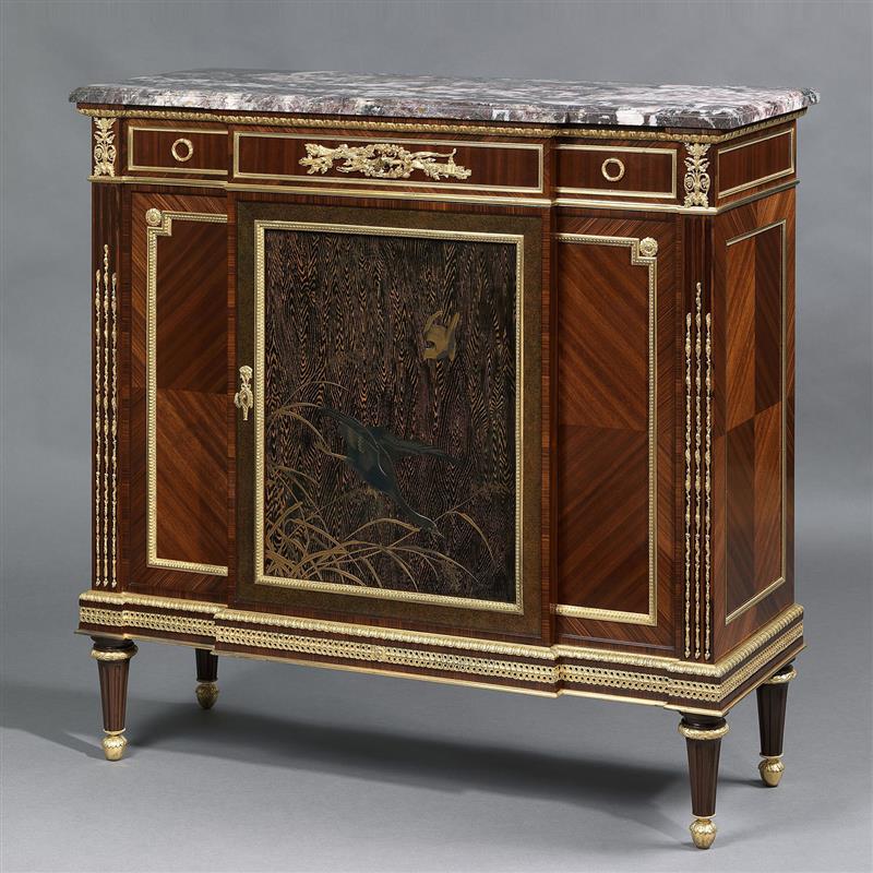 路易十六样式铜鎏金和日本漆画装饰西阿拉黄檀木镶花桃花心木边柜