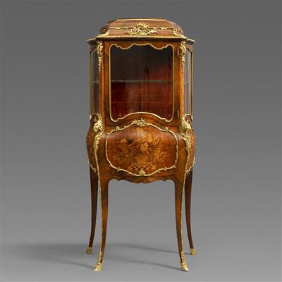 路易十六样式铜鎏金装饰缎木和西阿拉黄檀木细工镶嵌桃花心木展示柜