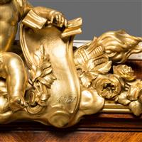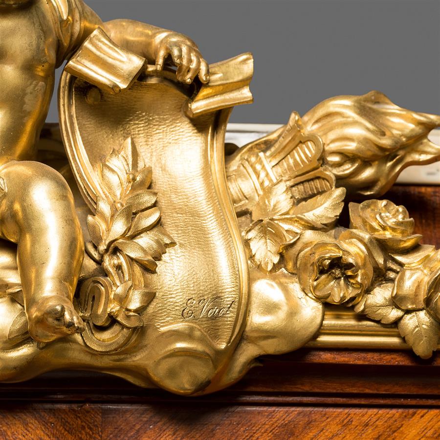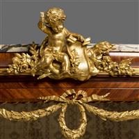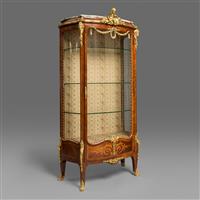 路易十六早期过渡风格,桃花心木主体,西阿拉黄檀木贴面,法国紫罗兰大理石顶面。柜体顶部装饰云端手持爱神之箭和书卷的铜鎏金丘比特,人物四周有花卉果实、火炬和箭筒;三面玻璃橱窗,门顶处有铜鎏金橄榄垂蔓,内部丝质软包背板,四层可调高度的储物格;柜门底部装饰铜鎏金花卉枝叶饰件,缎木和西阿拉黄檀木细工镶嵌左右对称的卷叶纹;立水装饰铜鎏金叶饰,两侧立柱上方装饰铜鎏金羊首,三弯腿装饰上下呼应的茛苕叶饰。顶部铜鎏金丘比特手持的书卷上有制造商E. Verot刻印签名。