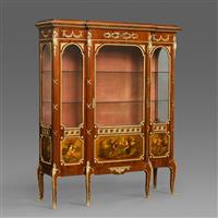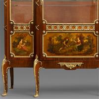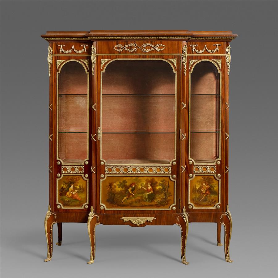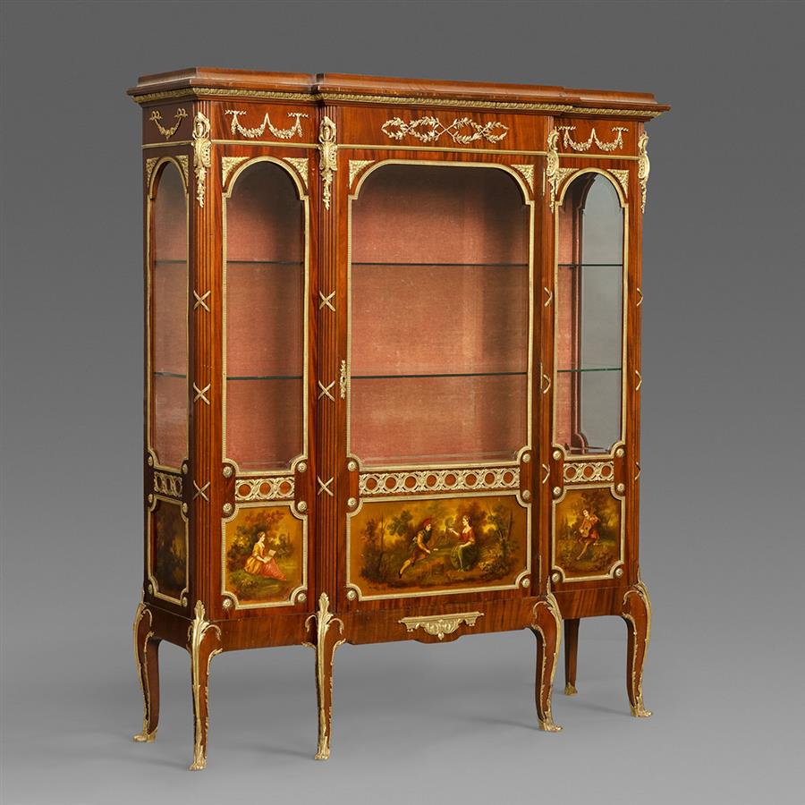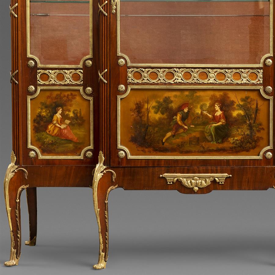 路易十五至路易十六过渡样式,桃花心木主体。柜体上楣中央装饰交叉缠绕的月桂枝叶铜鎏金,两侧装饰玫瑰垂蔓饰带;断层式正立面上层三面玻璃橱窗装饰铜鎏金边条,内部红色丝绒背板,三层高度可调储物格;下层三块面板镶嵌华托(Jean-Antoine Watteau, 1684-1721)风格的洛可可田园爱情马丁漆画绘板。立水、立柱和三弯腿装饰上下呼应的铜鎏金茛苕叶饰。