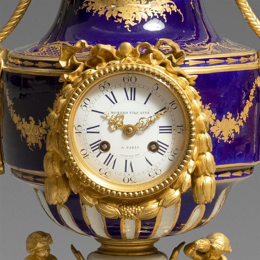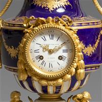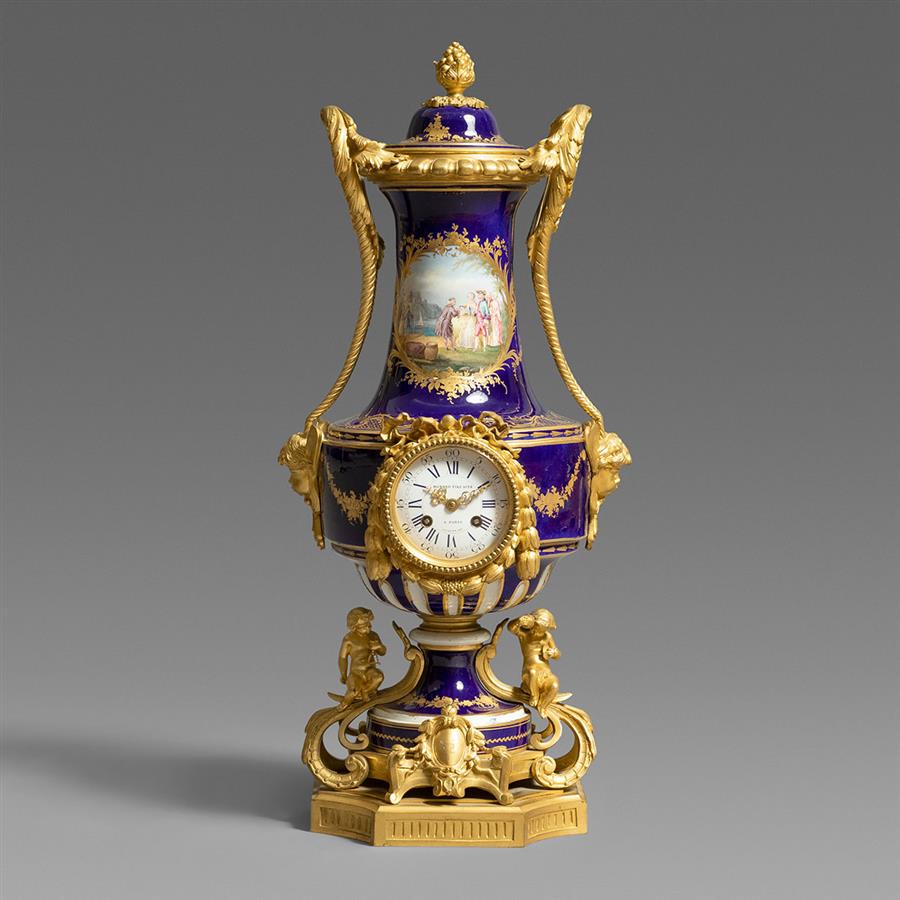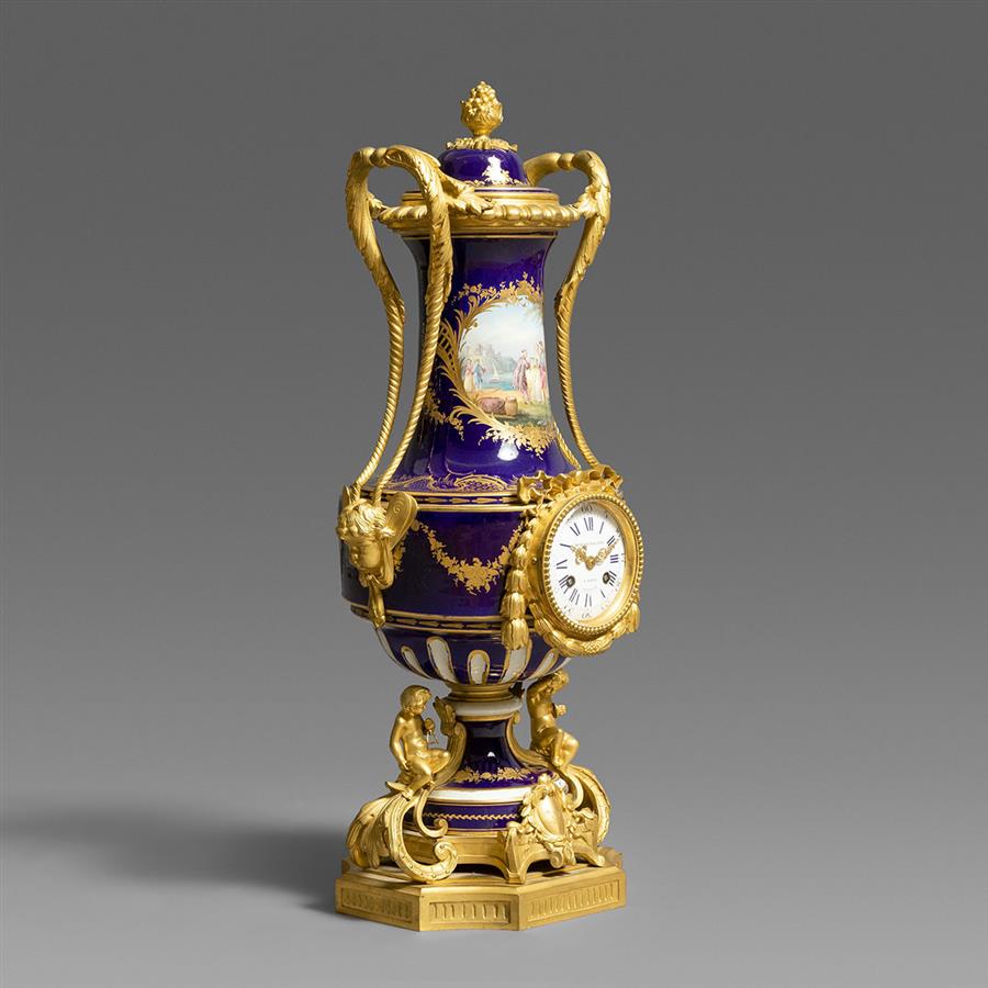 拿破仑三世时期铜鎏金装饰钴蓝地嵌珠手绘塞弗尔彩瓷壁炉钟