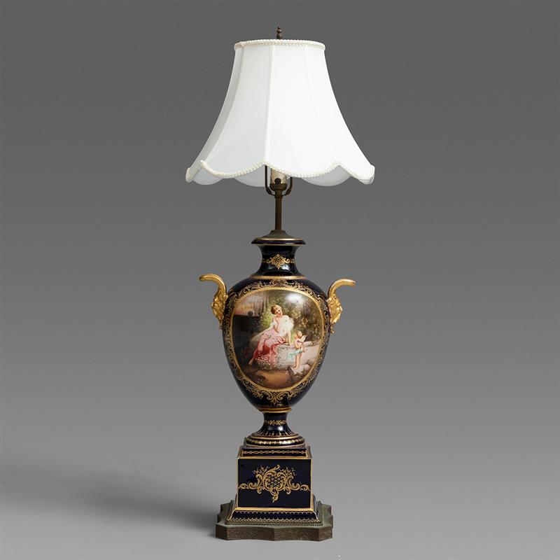 一对路易十六样式铜鎏金装饰塞弗尔式手绘钴蓝瓷瓶台灯