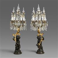 一对新古典风格着色青铜和巴氏合金人物六枝烛台