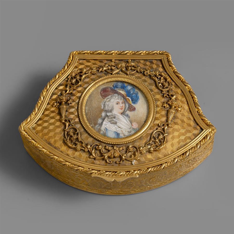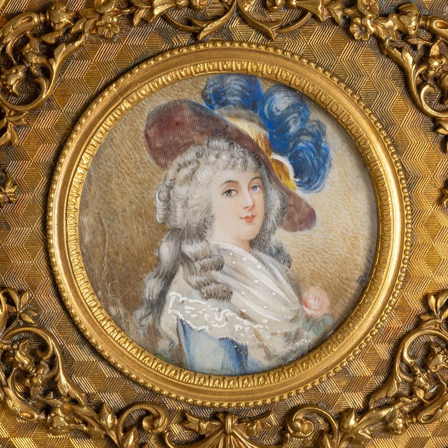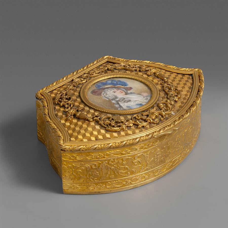 拿破仑三世时期新古典风格鎏金青铜盒体,锦地几何纹盒盖装饰高浮雕花卉宝瓶环饰,中央镶嵌一幅洛可可风格象牙肖像细密画,盒身錾刻浅浮雕卷叶纹。