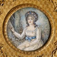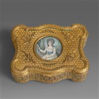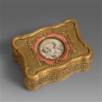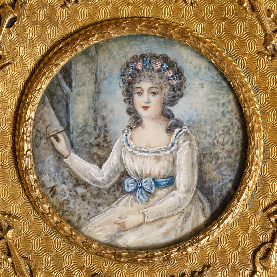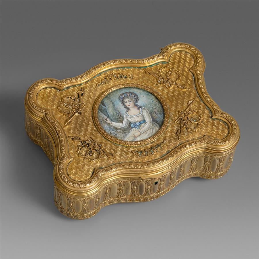 拿破仑三世时期新古典风格鎏金青铜盒体,锦地花卉盒盖四角装饰高浮雕号角花环,中央镶嵌一幅洛可可风格的女艺术家自画像象牙细密画,盒身装饰连续的浅浮雕卵形花蕊纹饰,盒底有经销商Casa Vignes de M P. Sánchez / Florida 361 / B-Aires铜币商标。