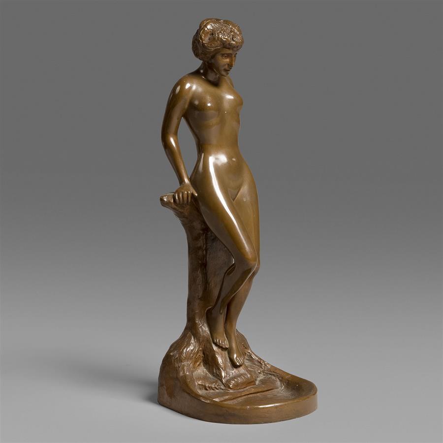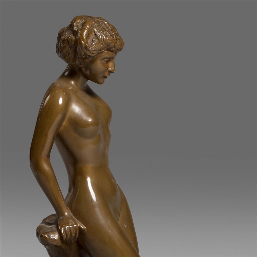新艺术风格作品描绘了一名裸露曼妙身姿的短发少女形象,少女身体微微向后倾斜,双手支撑在石柱之上,右脚轻踩踮起;人物身姿轻盈,流畅优美,恬静的脸部散发出一丝淡淡的笑容,目光凝视,似乎沉浸在遐想之中。作品底部有艺术家A.V. Skene签名及1910年款。