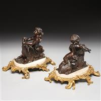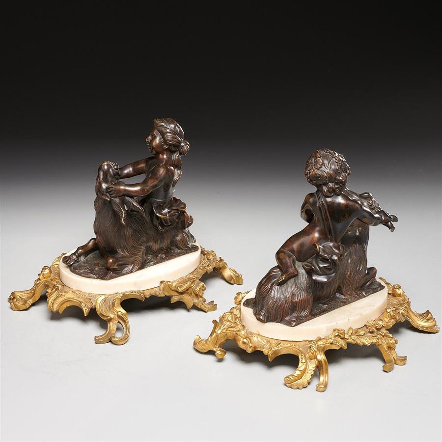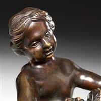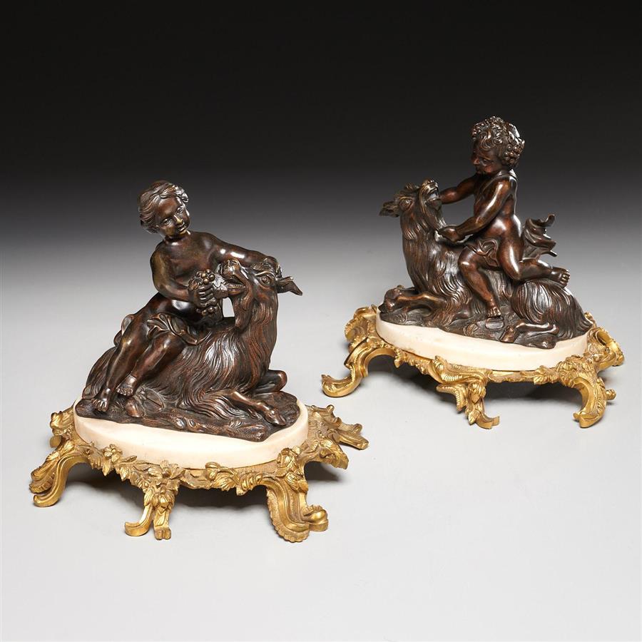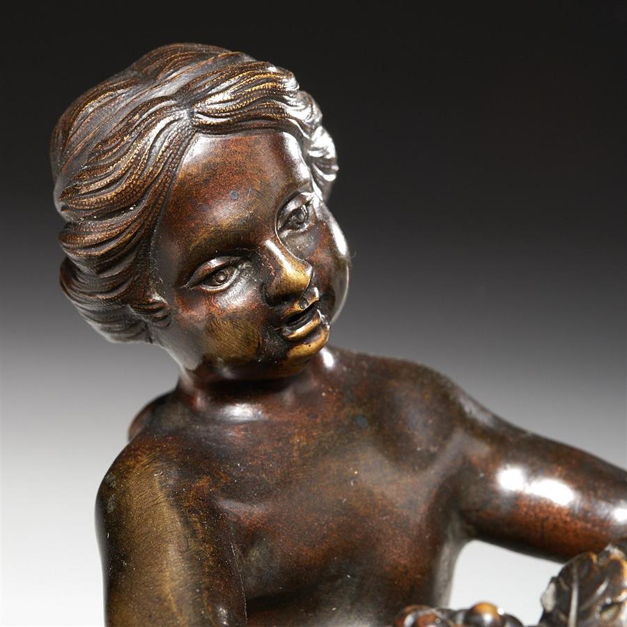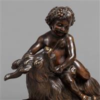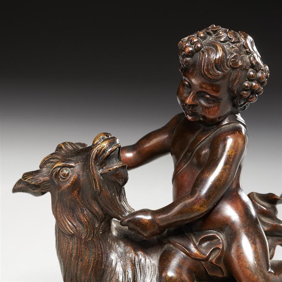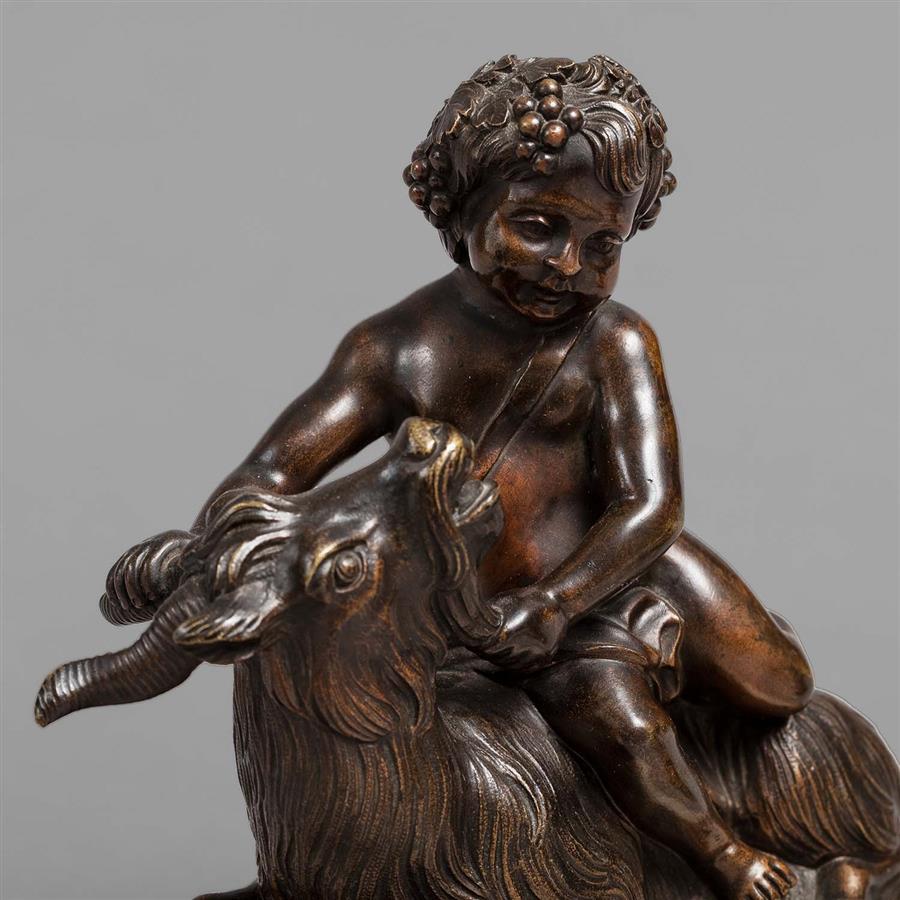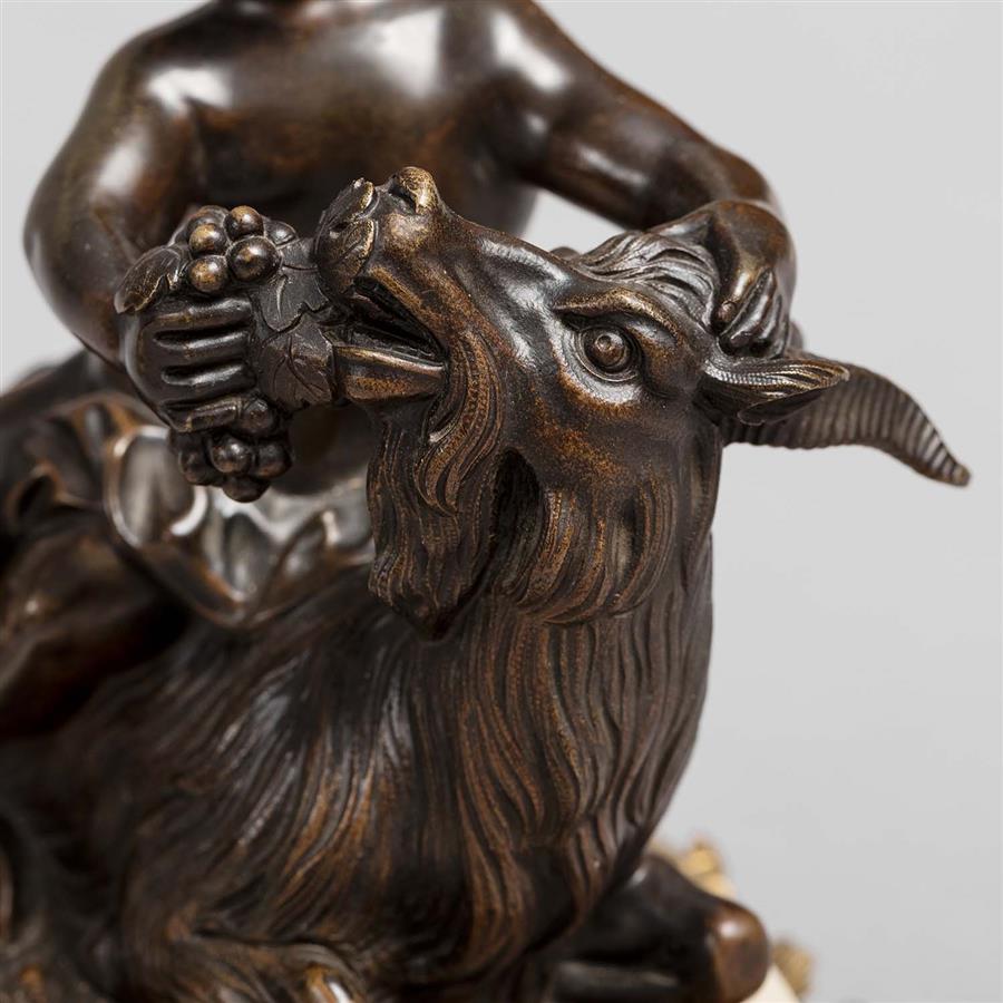 作品表现了一对酒神小天使俏皮地坐在山羊背上嬉戏的场景,其中一只小天使左手轻抚山羊头部,右手拿葡萄投喂山羊;另一只小天使右手轻抚山羊头部,左手轻拉山羊胡子与其玩耍。作品刻画的动静皆宜,栩栩如生,并配有铜鎏金镶嵌大理石底座。