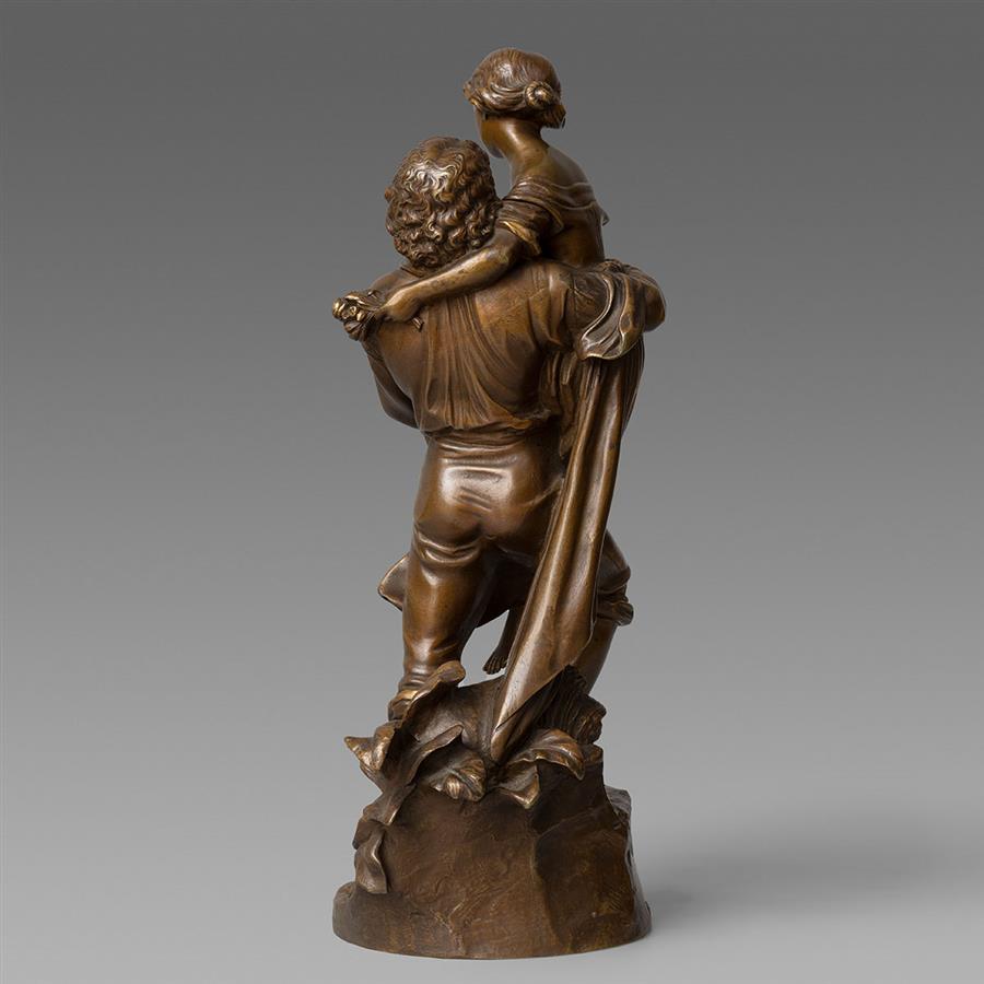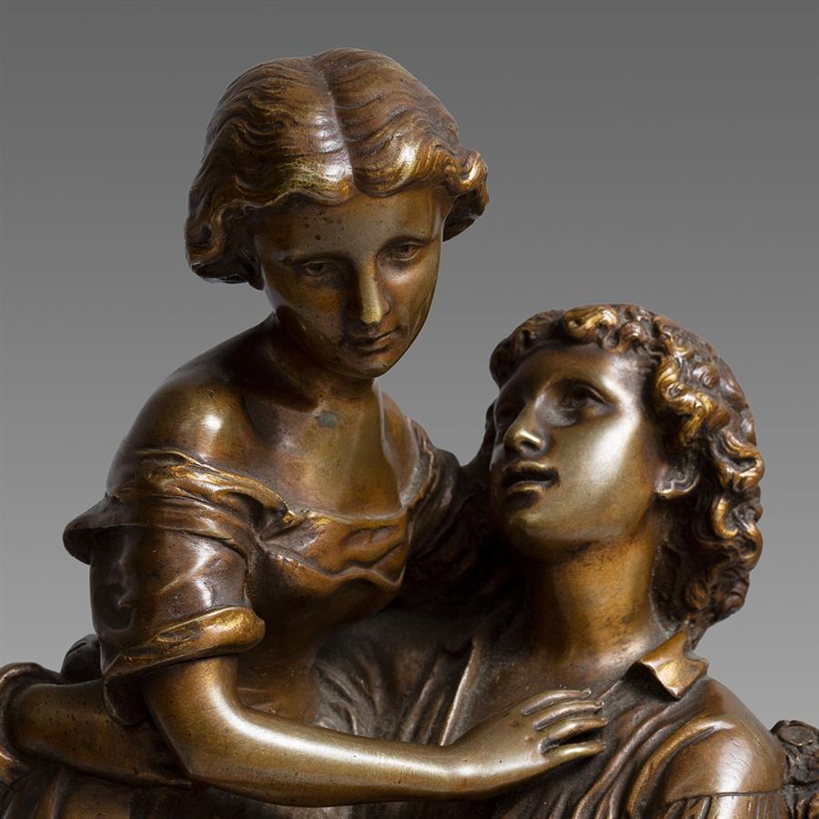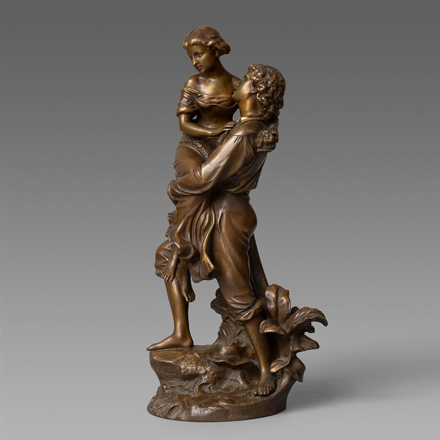 作品题材来自德国诗人歌德的著名叙事诗《赫尔曼与窦绿苔》第八歌天文女神墨尔波墨涅。赫尔曼与窦绿苔在圆月的陪伴下,穿过玉米地来到了漆黑的葡萄园。月光不时地透过葡萄枝叶,石阶上的窦绿苔不知道在哪落脚,一脚踩空,扭伤了脚踝,在即将跌倒的瞬间,敏捷的赫尔曼伸出手臂将他心爱的人抱住。窦绿苔脸上透露着羞涩的笑容,手臂环绕在爱人的背上,手中紧握着一束鲜花。作品通过瞬间姿态的捕捉以及精准的神情刻画,完美的展现了情侣之间热烈且羞涩的爱;赫尔曼神情十分坚定,充满着对未来生活的美好憧憬以及对窦绿苔宣誓着永恒的爱。作品基部有艺术家R. Cauer签名。
