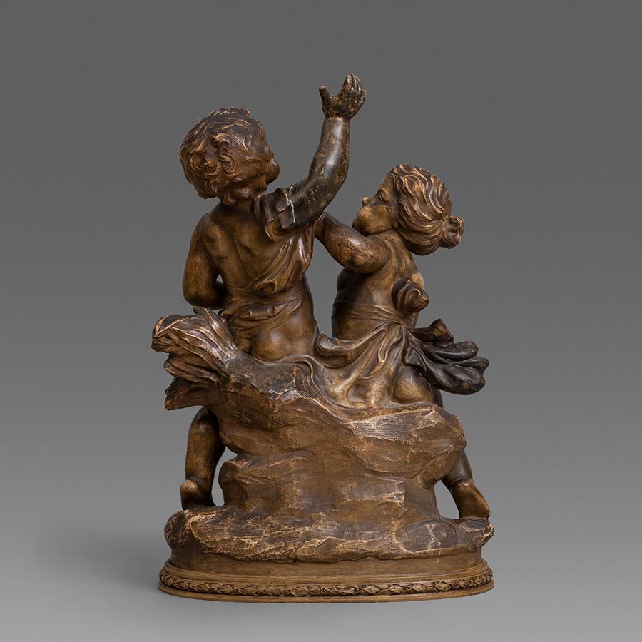 洛可可风格赤陶作品,描绘了两个小天使在山林中放飞鸟儿的场景。两个小天使坐在岩间树丛中,左侧的男孩左脚着地,仰望天空注视着高举右手刚刚放飞的小鸟,左手握着的另一只鸟儿拍打着双翼展翅欲飞;左侧坐在岩上的女孩右手抓着掉落的鸟窝,左手搭在同伴放鸟的上臂上,不舍的看着鸟儿的飞离。作品对人物的神情和动作进行了完美细腻地刻画,突出了儿童天真愉悦的主题氛围。