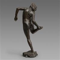 此青铜着色赤陶作品为德加1895至1900年间在巴黎维克托马塞街37号(37 Rue Victor-Massé in Paris)居住时构思,1917年德加去世后在工作室发现的150多件蜡模遗作之一,该雕塑以四种形态铸造青铜作品,此为第四形态。作品表现了一位舞女用右手抓起右脚的场景,女子身体向后扭曲,右脚脚心向上,左臂弯曲试图扬起,右手吃力的翻起脚掌检查。作品通过对人物动作瞬间的抓取,充分体现了艺术家对此题材细致入微的观察和生动的表现。