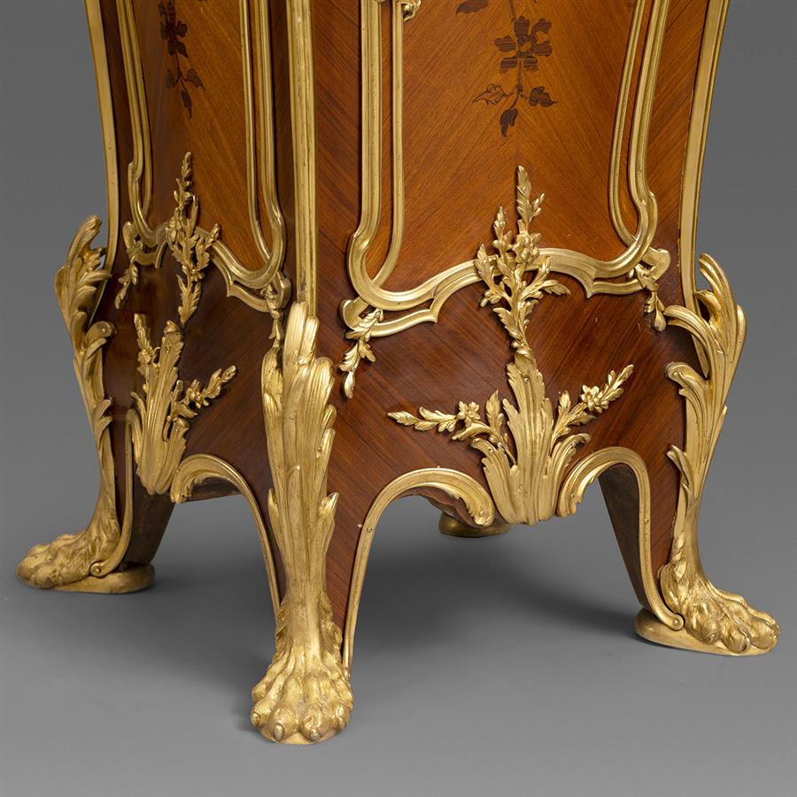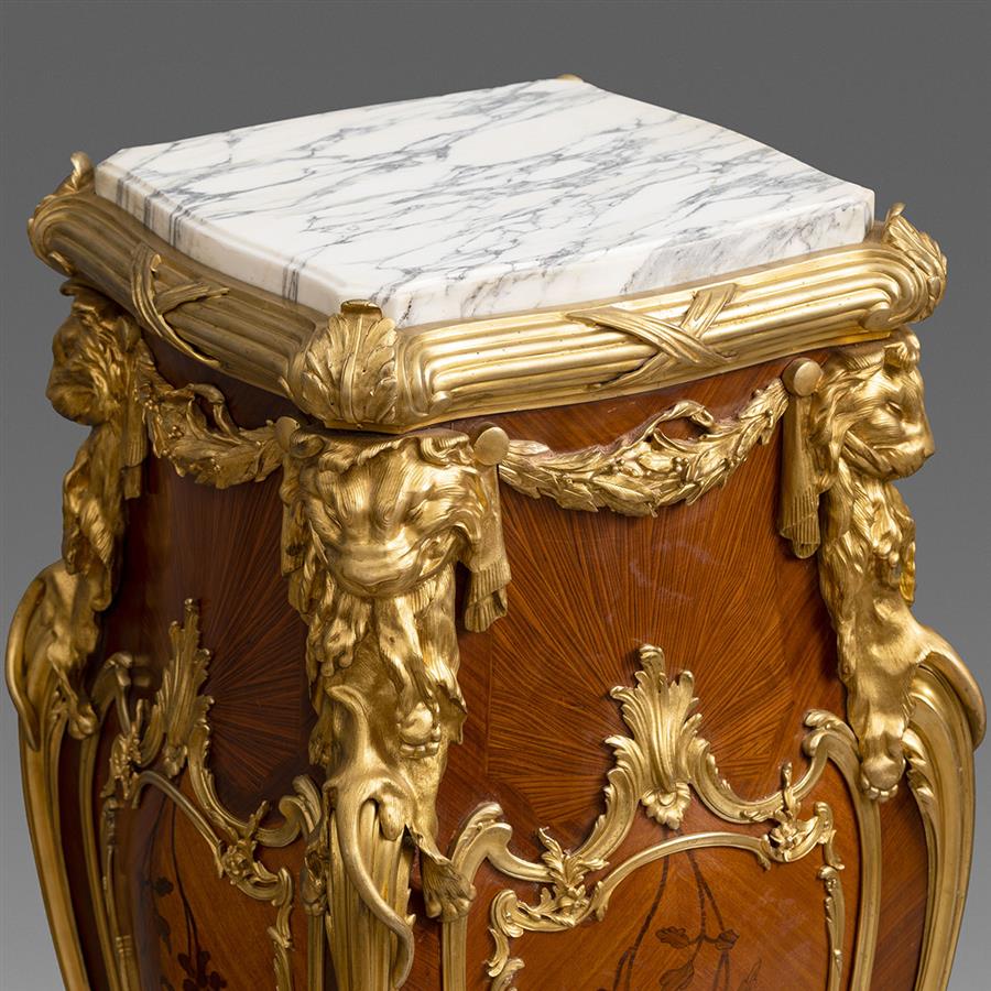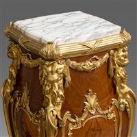 路易十五洛可可风格,像木主体,西阿拉黄檀木贴面。卡拉拉大理石顶面四角装饰铜鎏金茛苕叶饰。台架立面铜鎏金茛苕叶饰开光内西阿拉黄檀木和郁金香木细工镶嵌枝叶花卉纹饰;立柱上方装饰源于奥本和里茨内尔名作国王办公桌上的铜鎏金赫拉克勒斯狮皮,肩部铜鎏金橄榄花环与此相连;立水和弯腿装饰呼应的铜鎏金茛苕叶脉,狮爪底足。
