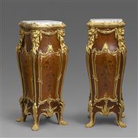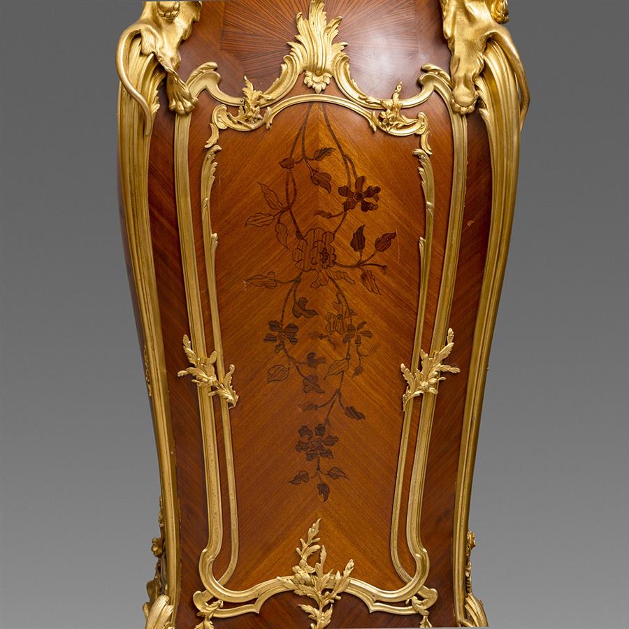 一对路易十五样式铜鎏金装饰西阿拉黄檀木与郁金香木细工镶嵌台架