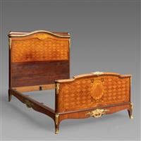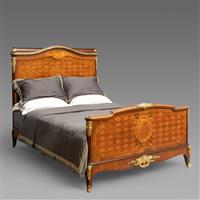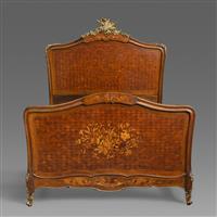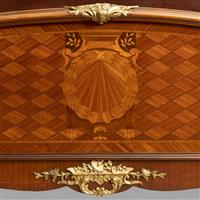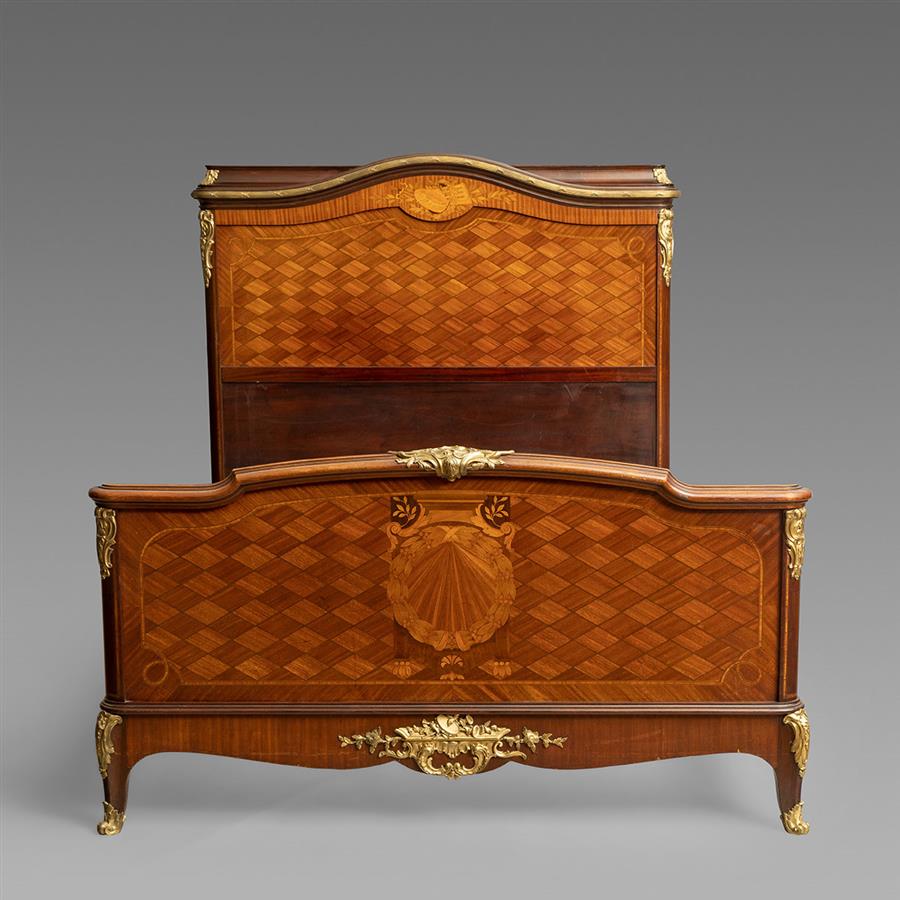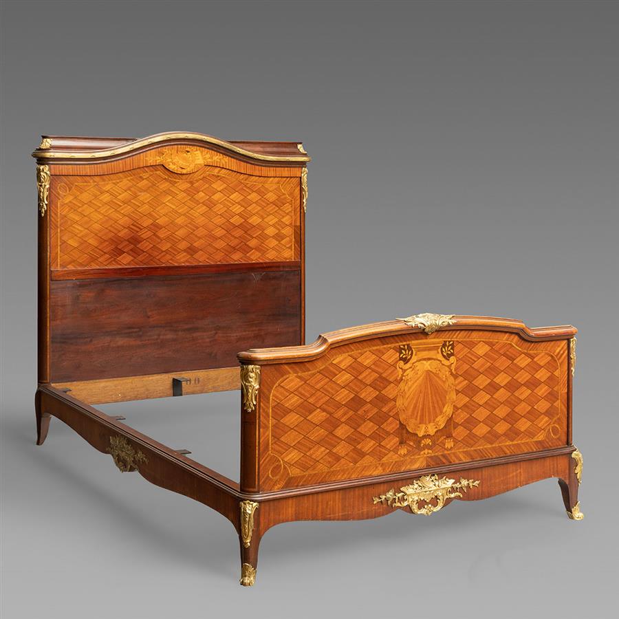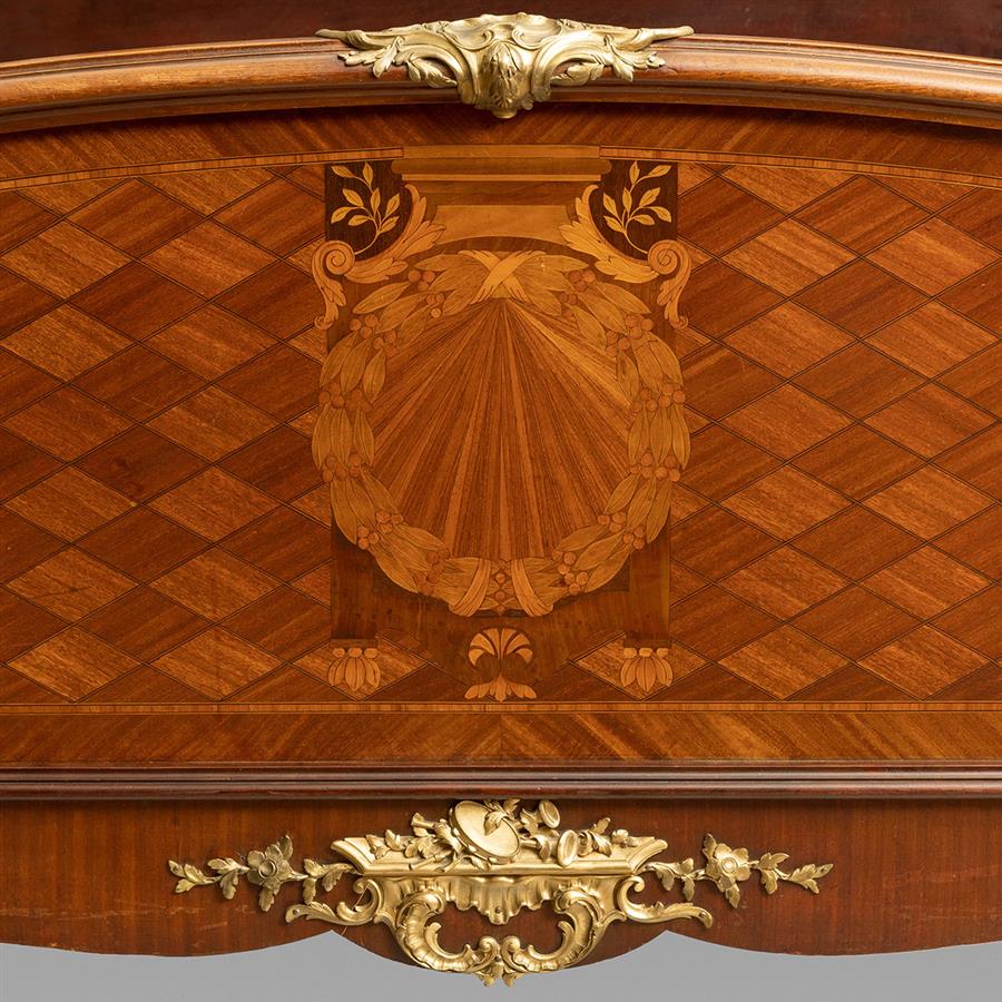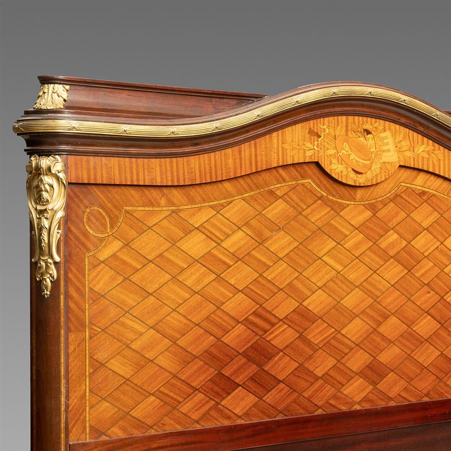 路易十五晚期至路易十六早期过渡风格,桃花心木主体。头板顶边装饰铜鎏金边条,上饰带中央缎木细工镶嵌花环、礼帽和乐谱花束,西阿拉黄檀木镶嵌网格纹,边柱上方装饰铜鎏金茛苕叶饰;尾板使用与头板相同工艺镶嵌网格纹,中央西阿拉黄檀木和缎木细工镶嵌橄榄花环;围板装饰铜鎏金花卉号角饰件,三弯腿装饰铜鎏金茛苕叶饰。