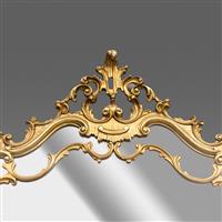 路易十五洛可可风格,山毛榉木框架贴金箔装饰。缟玛瑙桌面,望板雕刻涡卷茛苕,枝形弯腿雕刻卷叶花卉,X形横拉挡中央镂刻扇形涡卷;配套镜框外缘雕刻与桌体呼应的茛苕枝叶。