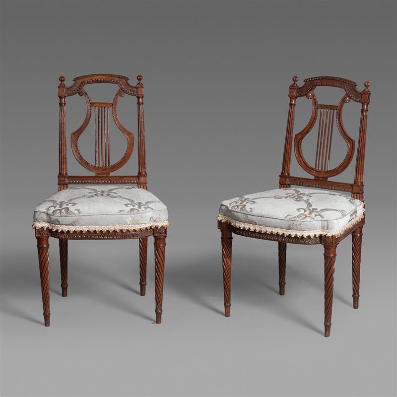 • 一对路易十六样式黄铜装饰局部金漆桃花芯木雕竖琴靠背椅