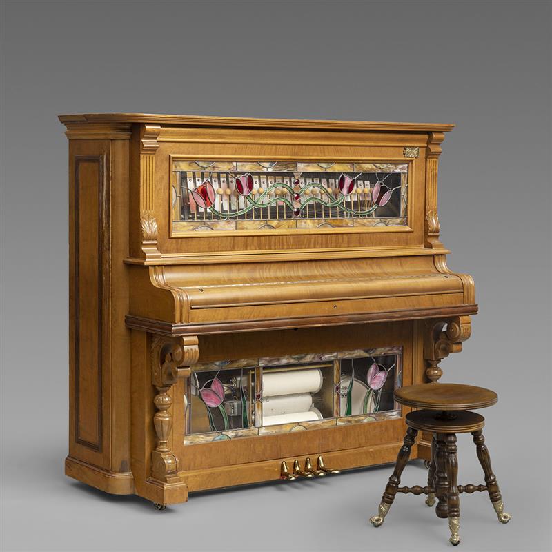 维多利亚晚期彩色玻璃装饰胡桃木立式自动钢琴