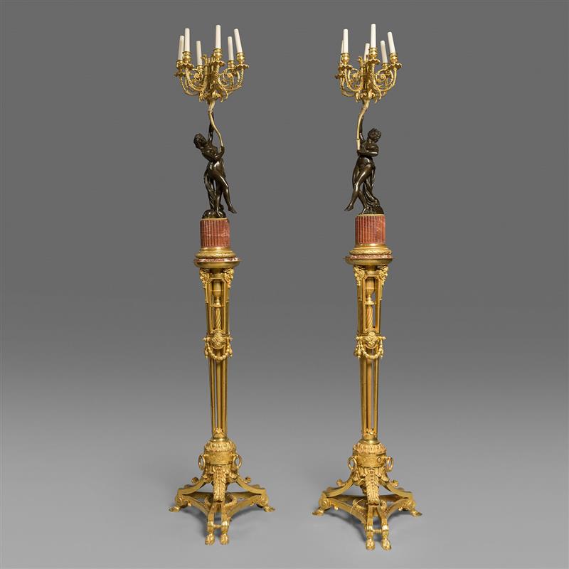 一对路易十六样式青铜人物脂红大理石七枝烛台及铜鎏金台架